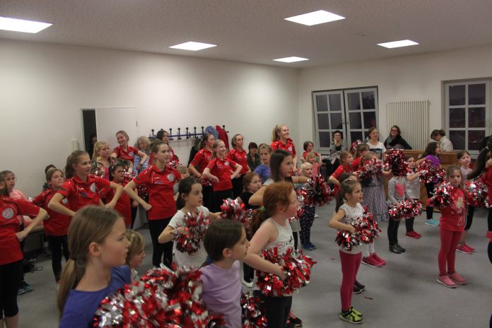 RHEINHESSEN (red) – In den kommenden Wochen bis zum Beginn der Osterferien bieten die CHAOTE-CHEERLEADER wieder Schnuppertrainings jeden Mittwoch im Rathaus in Klein-Winternheim an und beim gestrigen Training platzte der Trainingsraum aus allen Nähten. Das Trainerteam der CHAOTE-CHEERLEADER um Headcoach Jeremy D. Frei mit seinen Co-Trainerinnen Emy Guarracino und Janine Pinker konnte 28 interessierte Mädchen und junge Damen zum Schnuppertraining begrüßen und sie in die Welt des Cheerleadings entführen. Mit einem Aufwärmtraining starteten die sieben- bis elfjährigen CC *peewees* und die 12- bis 20-jährigen CHAOTE-CHEERLEADER in das Schnuppertraining gemeinsam mit Trainerin Emy, die Dehn- und Lockerungsübungen vormachte und die Mädchen machten eifrig mit. Beim Cheerleading gibt es besondere Bewegungsabläufe, erklärte Cheftrainer Jeremy, die „Motions“ genannt werden und mit viel Körperspannung ausgeführt werden. Dann kam der große Moment für die Cheerleader-Neulinge: Jeder der Mädchen durfte sich sich zwei Pom-Poms nehmen und erste Elemente einer Cheerleader-Choreographie wurden einstudiert. „Ich hab schon immer solche Wuschels gewollt.“, so die 12-jährige Sophie, die voller Stolz ihrer Mutter die Pom-Poms zeigte.