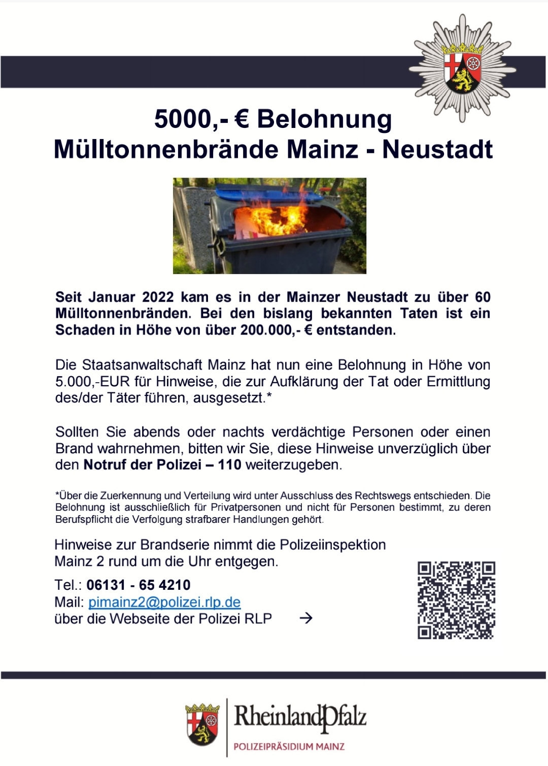 Die Staatsanwaltschaft Mainz hat nun eine Belohnung in Höhe von 5.000,- EUR für Hinweise, die zur Aufklärung der Tat oder Ermittlungdes/der Täter führen, ausgesetzt. Über die Zuerkennung und Verteilungwird unter Ausschluss des Rechtswegs entschieden. Die Belohnung ist ausschließlich für Privatpersonen und nicht für Personen bestimmt, zuderen Berufspflicht die Verfolgung strafbarer Handlungen gehört.