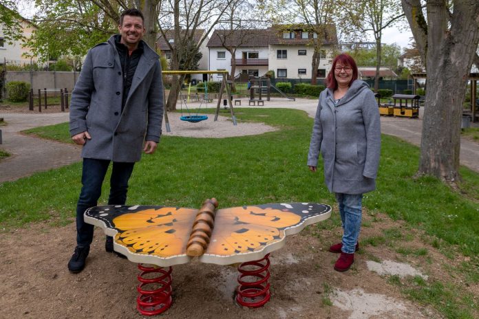 Der hübsche Flattermann hat auf einer kleinen Anhöhe Platz genommen und ergänzt die abwechslungsreiche Spiellandschaft auf einem der größten Spielplätze in Nieder-Olm. Bürgermeister Dirk Hasenfuss und Beate Berschneider, Beigeordnete der Stadt, besuchen den tierischen Zuwachs, der kurz zuvor von Mitarbeitern des städtischen Bauhofs angebracht wurde. „Wir möchten die Spielplätze unserer Stadt für die Kinder attraktiv und sicher gestalten. Diese freuen sich natürlich auch über Neuheiten, wie diese“, informieren sie. Und der Schmetterling sei übrigens nicht das einzige Tier, das auf Nieder-Olms Spielplätzen eine neue Heimat finde, verrät der Bürgermeister. Auf dem Bauhof warte außerdem noch ein Vogel-Wipptier, das demnächst auf der Spielanlage ‚Im Kalkofen‘ landen werde. Insgesamt hat die Stadt für beide Geräte 4200 Euro investiert.