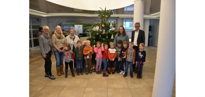 In den vergangenen Wochen hatten sie in der Kita schon fleißig Weihnachtsschmuck gebastelt und brachten diesen dann am Freitag ins Rathaus. Ihre schönen Ergebnisse präsentierten sie gemeinsam mit ihren Erzieherinnen und Erziehern und hängten ihn anschließend an den Weihnachtsbaum.