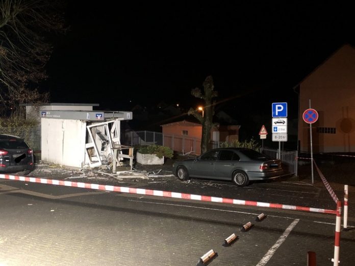 UPDATE: Nach der Sprengung des Geldautomaten kam es wenige Minuten nach der Tat, zur Verfolgung eines dunklen PKW auf der Autobahn A 60 in Richtung Bingen. Der mutmaßlich unbeleuchtet geführte PKW wurde mit unverantwortlich hoher Geschwindigkeit geführt. Zur Vermeidung von Gefährdungen unbeteiligter Verkehrsteilnehmer und aufgrund nicht mehr zu verantwortender Geschwindigkeitsbereiche wurde dem Fahrzeug im Bereich des Autobahndreiecks Mainz nicht mehr eng gefolgt und mangels Beleuchtung aus den Augen verloren. Nach derzeitigem Ermittlungsstand könnten die Täter über die A643 in Richtung Hessen weiter geflüchtet sein. Zur Fahndung unterstützten alle benachbarten Polizeipräsidien in Rheinland-Pfalz und Hessen mit Einsatzkräften und bestreiften insbesondere die Autobahnen.