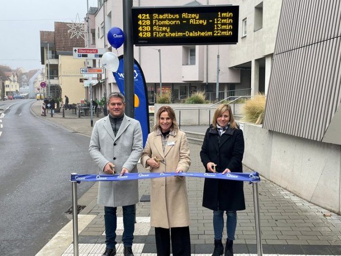 ALZEY (k)- In Alzey wurde heute ein weiterer Meilenstein für einen modernen und kundenfreundlichen öffentlichen Nahverkehr gesetzt. Direkt am Museum nahm der Rhein-Nahe Nahverkehrsverbund (RNN) einen neuen DFI-Anzeiger offiziell in Betrieb. Das LED-Display liefert Echtzeitinformationen zu Abfahrten, Verspätungen und möglichen Störungen – ein Komfort, der Fahrgästen künftig an immer mehr Haltestellen zur Verfügung stehen soll. Insgesamt plant der RNN die Installation von mehr als 30 dieser digitalen Anzeigen im Verbundgebiet.