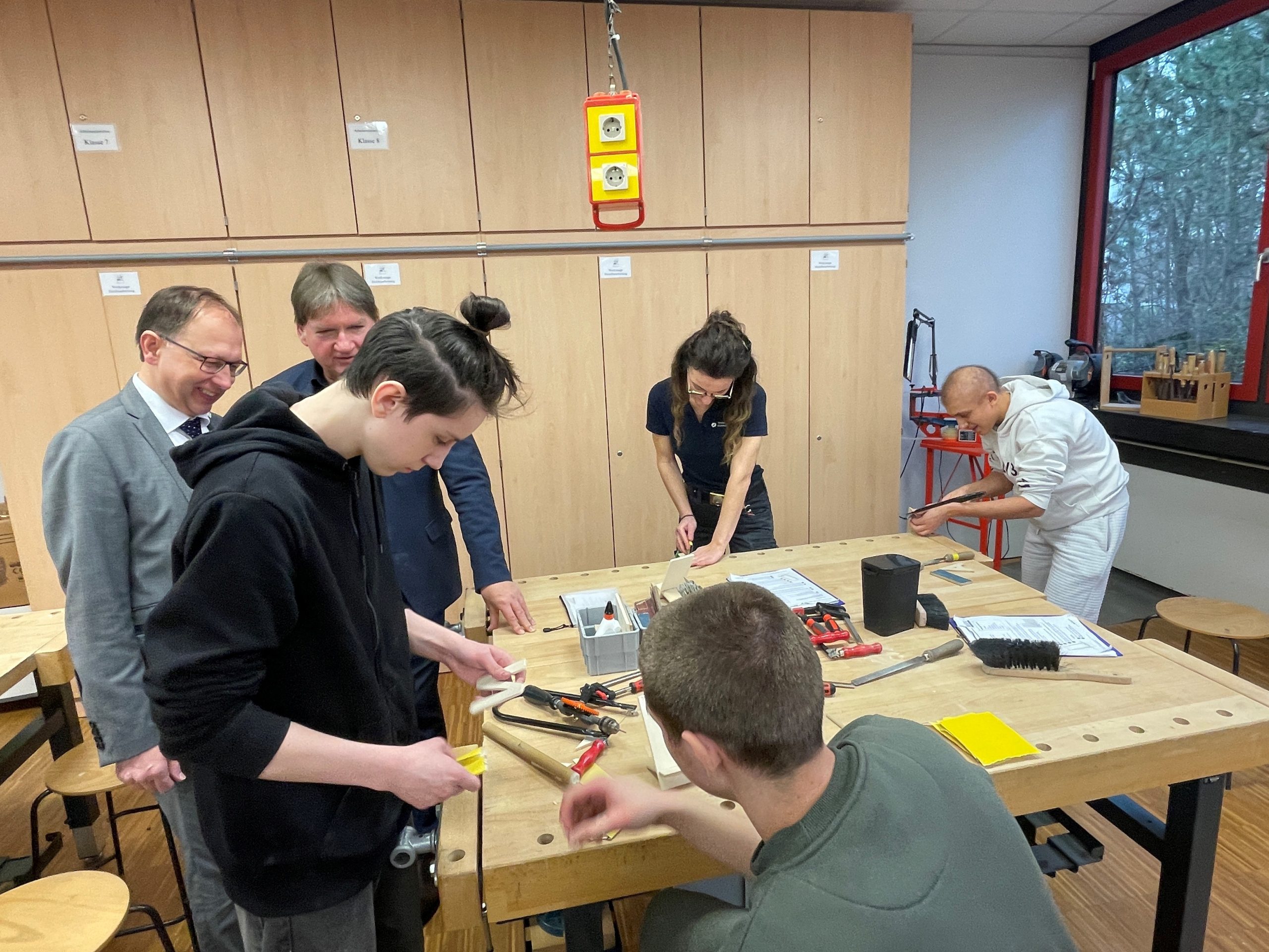 Das mobile Makerspace der Handwerkskammer Rheinhessen macht Station in der Erich-Kästner-Realschule plus in Wörrstadt. Landrat Heiko Sippel (3.v.l.) und VG-Bürgermeister Markus Conrad (2.v.l.) machen sich vor Ort ein Bild über das praktische Angebot für die Schülerinnen und Schüler. Foto: Simone Stier /Kreisverwaltung Alzey-Worms