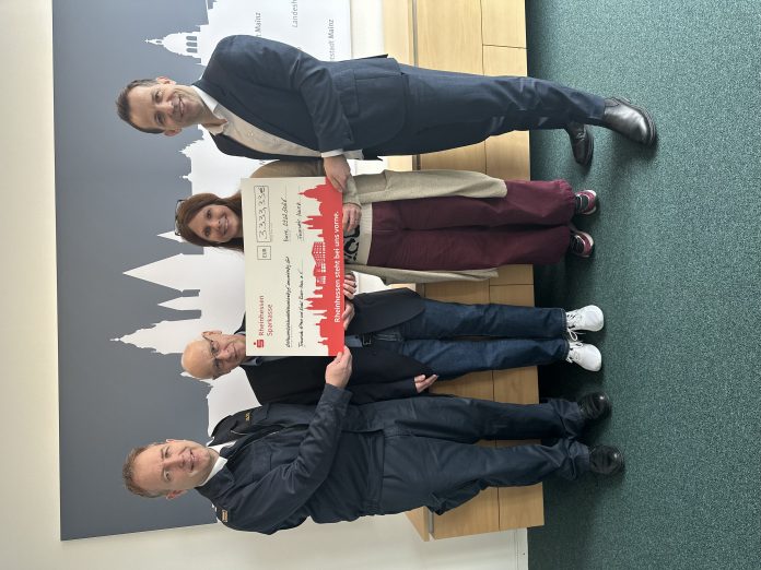 MAINZ (bs/fw) – Der Mainzer Oberbürgermeister Nino Haase und Mark Jüliger, Abteilungsleiter Technik der Feuerwehr Mainz, überreichten am Montag, 9. Februar 2026, den Spendenscheck aus dem traditionellen Abschwimmen an Nicole Sieben und Joachim Niebling vom Verein Trauernde Eltern & Kinder Rhein-Main e. V.